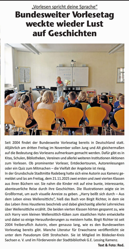 Die Lesung war echt klasse. Selbst ich als erwachsener Zuhörer war begeistert und wünsche mir einen Fortgang der Geschichte mit dem Wellensittich. Vorteilhaft waren die eingesetzten Poster mit Bildern aus der Geschichte. Dadurch wurde das Vorgetragene für die Kids lebendiger. Wir freuen uns auf eine weitere Lesung mit Birgit Richter und wünschen ihr viele neue Ideen und weiterhin viele